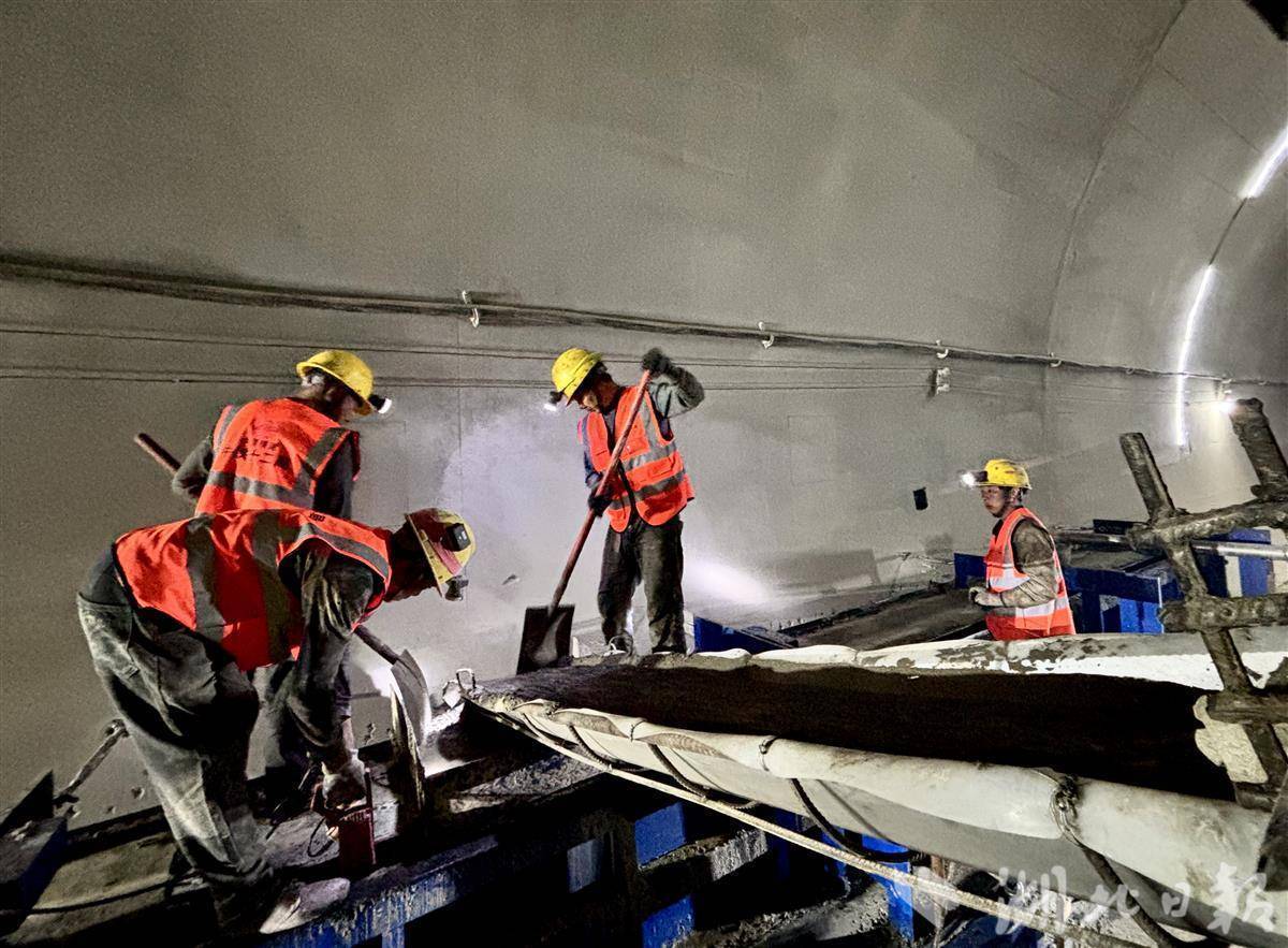 从当阳市玉泉街道枣林村的省道转入深山,行驶到便道的尽头,冒出一个11米多高的洞口,混凝土搅拌车、渣石清运车不断进出。漆黑的斜井里,耳边风机隆隆,脚下碎石声响,深入约千米后,工人们正在二衬台车上作业。“因隧道结构复杂,每天有大量溶洞的涌水要排出,但斜井是向内的大斜坡,所以需要用水泵反坡抽排。”指着一排延伸至洞口的水管,中铁十二局项目部副经理宋永坤说。