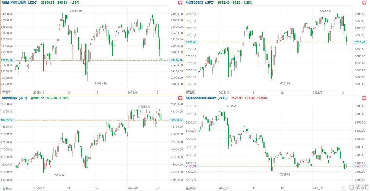 美国1月挑战者企业裁员人数升至2009年以来同期最高,美股三大指数集体收跌,道指跌1.2%,纳指跌1.59%,标普500指数跌1.23%,热门科技股普跌,超微电脑、高通跌超8%,微软跌近5%,亚马逊跌超4%,AMD跌超3%,特斯拉跌超2%,英伟达跌超1%。